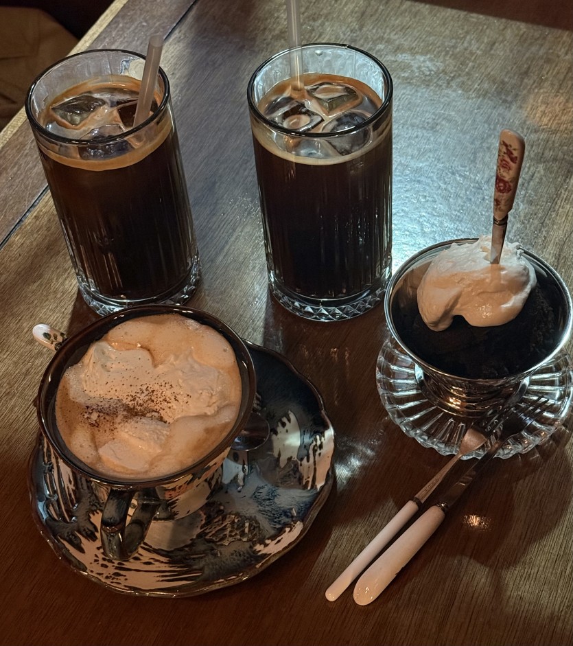 I ordered a hot Viennese coffee and a chocolate fudge. Viennese coffee isn't something I usually go for — I normally drink iced Americano — but it felt like the natural choice in that setting, so I gave it a try. It came in a pretty teacup topped with a generous layer of whipped cream. The coffee itself had a slight sweetness, and the cream added richness without making it heavy. A simple combination, but it worked well together.